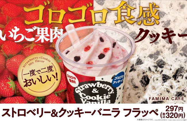 このたびは、「40のいいこと!?」の5つのキーワードの1つである『もっと美味しく』の一環として、2014年から発売し累計販売数2億個を超える、コーヒーマシンのミルクで作る「FAMIMA CAFE」のフラッペシリーズから、2021年に発売してご好評をいただいた「リッチフラッペストロベリー」と「クッキーバニラフラッペ」を合体させた「ストロベリー&クッキーバニラフラッペ」297円(税込320円)を2021年12月26日(日)から、全国のファミリーマート約16,600店にて発売いたします。