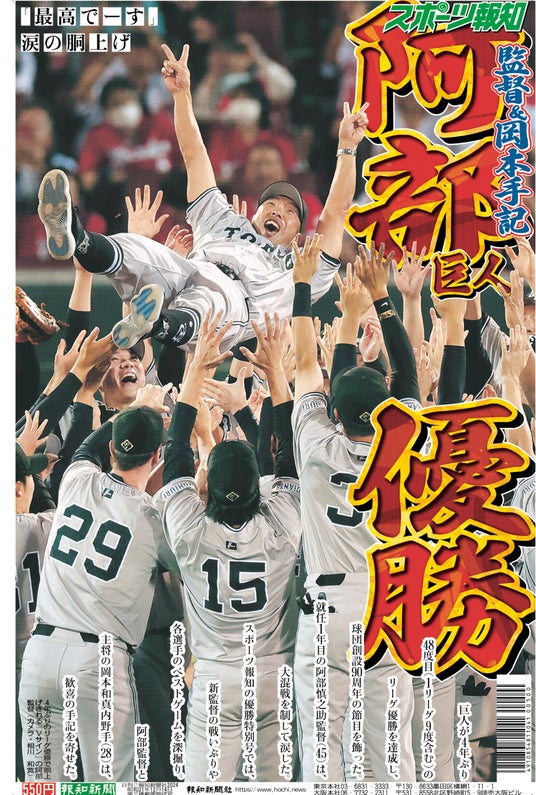 スポーツ報知を発行する報知新聞社(代表取締役・依田裕彦)はプロ野球・巨人のリーグ優勝を記念してタブロイド新聞「巨人リーグ優勝特別号」を発売。その表紙が公開されました。発売は9月30日から順次になります(発送の関係で地域により数日送れる地域があります)。特別号には就任1年目で4年ぶりのリーグ優勝に導いた阿部慎之助監督とキャプテン・岡本和真選手の手記を掲載。そのほか各主力選手のシーズンのベストゲームを特集しています。歓喜のビールかけシーンの写真も収録。この特別号で今年1年の巨人の足跡がわかります。毎日現場で取材を続けるスポーツ報知の記者だからこそ書ける内容になっています。販売は読売センター(YC)、コンビニ等。ショップ報知、スポーツ報知Yahoo!ショップでの通信販売も行っています。