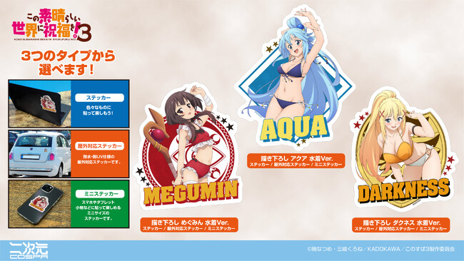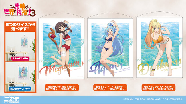 描き下ろしイラストを使用した水着姿「アクア」「めぐみん」「ダクネス」のタペストリー、ステッカーが二次元コスパから登場。