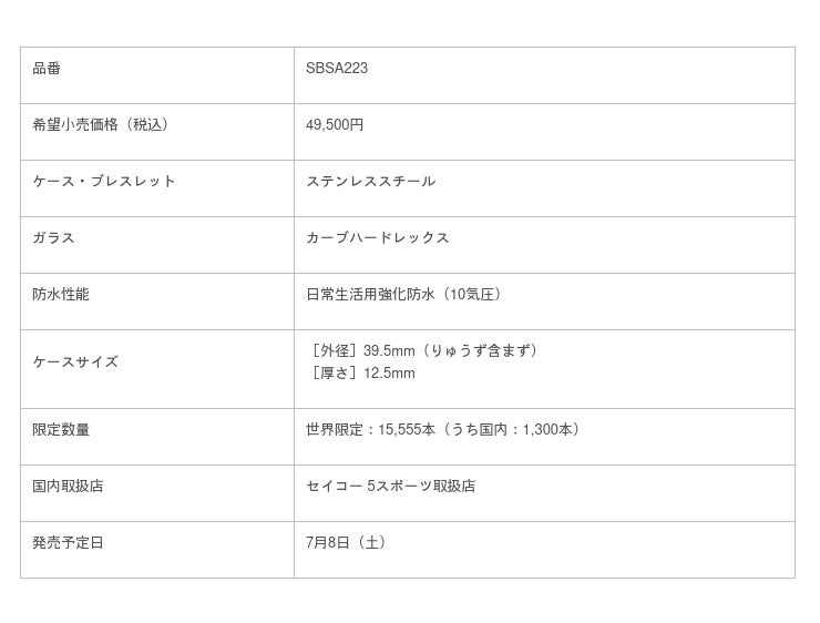 セイコーウオッチ株式会社(代表取締役社長:内藤昭男、本社:東京都中央区)は、<セイコー 5スポーツ>から、ブランド誕生55周年を記念した、初代セイコー 5スポーツの復刻限定モデル1機種と、ブランド創成期の代表的なモデルのデザインを色濃く受け継いだレギュラーモデル3機種を発売いたします。限定モデル1機種は7月8日(土)より発売、希望小売価格は49,500円(税込)です。レギュラーモデル3機種は9月8日(金)より発売、希望小売価格は各44,000円(税込)です。