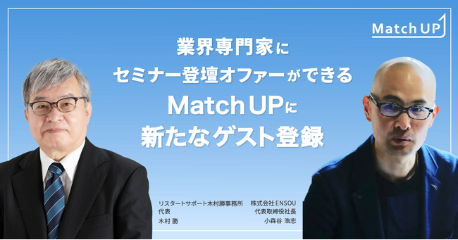 株式会社イノベーション(東証グロース 証券コード3970)のグループ会社である、株式会社Innovation & Co.(本社:東京都渋谷区、代表取締役社長:齊藤 和馬、以下「Innovation & Co.」)は、業界専門家に企業が主催するセミナー/イベントへの登壇オファーができるマッチングサイト「Match UP」に、リスタートサポート木村勝事務所 代表 木村 勝氏、株式会社ENSOU 代表取締役社長 小森谷 浩志氏など、豪華専門家が新たにゲスト登録されたことをお知らせします。