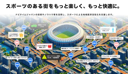 「スポーツ×観光×交通」の共創とDX支援を通じて、スポーツによる地域活性化に取り組む自治体や事業者向けのソリューションの提供や、課題解決のサポートに取り組んでいます。具体的には、経路探索の技術や移動に関わるサービスの開発・提供、移動‧交通ビッグデータ分析等の知見を生かし、スタジアム観戦を行う1日を旅と捉えて地域コンテンツを発信する『ユニタビ』の企画・開発や、スポーツ観戦時の観戦客の行動変容を生み出し、地域周遊や地域消費を促進して地域活性化を目指すソリューション『スポちず』などを提供しています。
