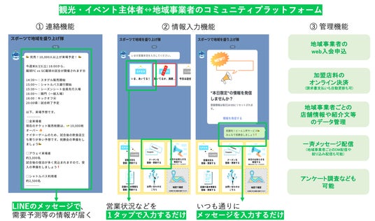 地域事業者はLINE経由でイベント来訪予測等の需要が共有され、営業状況やクーポンのリアルタイム発信も可能に