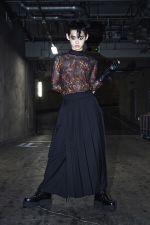 ワンウェイプリーツ仕立てのスカートを組み合わせたパンツと、炎をプリントしたシアートップス。右側からはパンツ、左側からはプリーツスカートに見えるハイブリッドなシルエットに仕上げている。有機的な炎を、赤・オレンジ・黄の3色のグラデーションで表現したトップスは、フィット感に優れたチュール生地を使用。