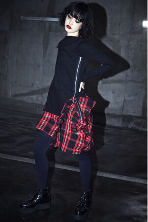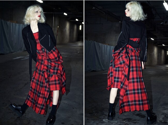 黒糸が多めのレッドタータンのワンウェイプリーツスカートとブラックデニムのトップスという異素材を組み合わせたミニドレス。モックアップのボートネックに、左脇下からウエスト下まで伸びるロングジッパーがポイント。プリーツによって生み出されたスカートは、トップスの両脇に配されたスリットからのぞく優雅な膨らみが特徴。