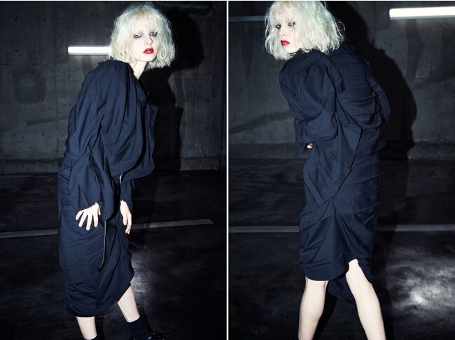 広幅のワンウェイプリーツで仕立てたジャケットとスカート。ジャケットの前身頃から肩、そして腕にかけてゆるやかな放射線状を描くラインと、後身頃に置かれた真横に伸びるラインの組み合わせによって、ダイナミックな分量とシルエットを形成している。スカートは身体を包み込むようにツイストされており、一見タイトに見えるが、プリーツによって稼働域が確保されている。右脇から膝上まで伸びるロングジッパーもポイント。