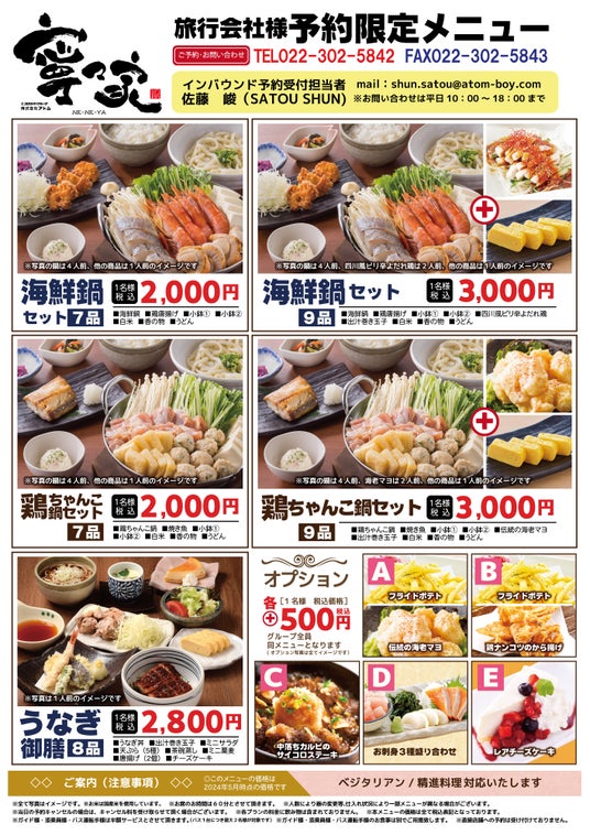 コロワイドグループの株式会社アトム(本社:神奈川県横浜市、代表取締役社長:田中 公博)は居酒屋「寧々家」他、2024年8月1日(木)から主に旅行代理店様向けインバウンドツアー受付サービスをWEB上でスタート致しました。