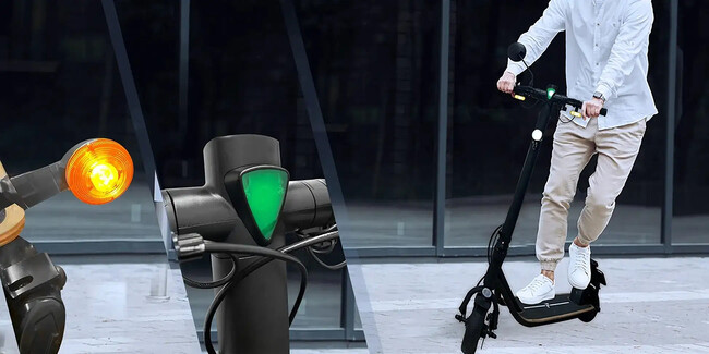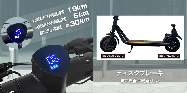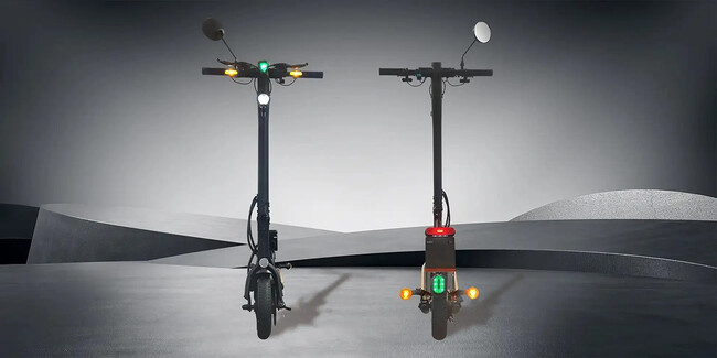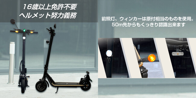 識別点滅等火(最高速度表示灯)、ウィンカー(車体前後装備)、ヘッドライト、バックミラー、警音器、テールランプ、ナンバー灯を装備。明るく大きな前照灯、ウィンカーは原付相当のものを使用し、50m先からも認識可能です。価格は7万円代と歩道/公道走行対応特定小型区分の電動キックボードとしては最安値でリーズナブル。