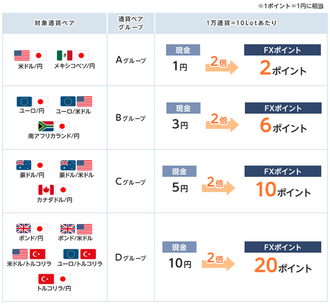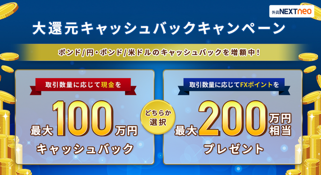 対象期間中の『外貨ネクストネオ』における指定通貨ペアの新規注文の取引量に応じて、最大200万円相当のFXポイント、もしくは現金100万円のキャッシュバックをいたします。