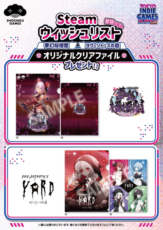 会場では、出展タイトルをウィッシュリストに登録いただくと『夢幻桜楼閣』と『ヨグ=ソトースの庭』のオリジナルクリアファイルを1名様につき1枚ずつプレゼントいたします。