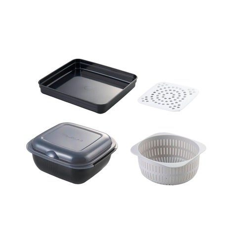 電子レンジで美味しい料理を手軽につくることができる調理容器。炊く・煮る・蒸す・炒める・茹でる・オーブン調理と万能ツールのグルラボ。中身をこぼさないスリットのコランダーがセットされているため、お米なら研いでそのまま炊飯までまとめてできます。
