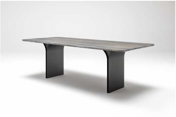 縞模様のテーブルトップがまるで浮かんでいるようなデザインのダイニングテーブル「990」。存在感が際立つ天板とシャープな脚部との対比が魅力。天板は8種の上質な無垢材・サイズは6種から選択可能で、空間に合わせてフレキシブルにオーダーいただけます。