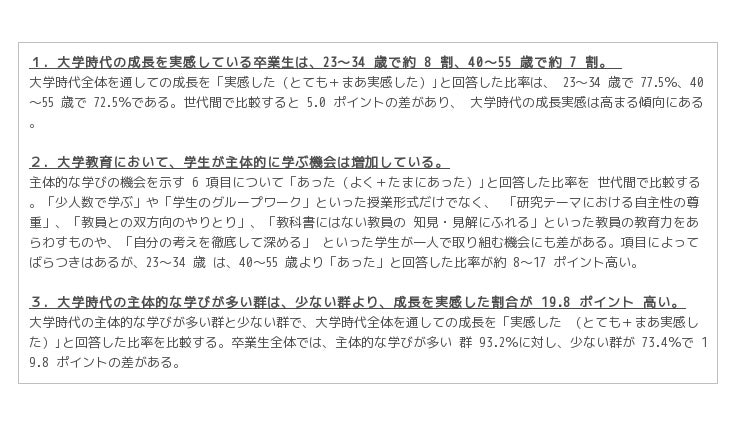 なお、調査では「大学教育」が、大学時代の「学びの充実」や「成長実感」、さらには卒業後の「自己効力感」 にどう関連するかを確認しました。また、調査対象を、大学教育を受けた時期が、改革が本格化する前の層 (40~55 歳)と後の層(23~34 歳)に分け、2 つの世代間で比較することで、改革による変化を明らかにしまし た。
