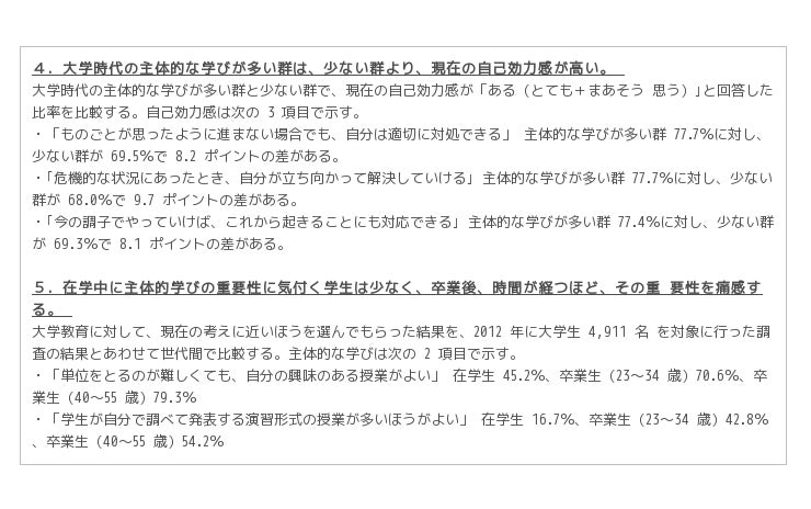 今回の調査結果から、大学教育における主体的な学びがもたらす成長実感、さらに現在の自己効力 感が明らかになりました。主体的な学びの場が、近年の大学教育改革により増加し、学生の成長実感 が高まる傾向がみられます。このことは、大学がより学生を成長させる学びの場に変化してきたこと の表れであり、近年の大学教育改革の成果といえます。