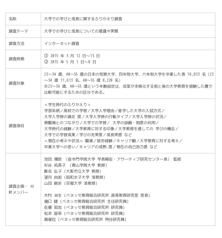 株式会社ベネッセホールディングス(本社:岡山市、以下ベネッセ)の社内シンクタンク「ベネッセ教育総合 研究所」では、2015 年、3 月、5月、全国の短期大学、四年制大学、六年制大学卒業の学歴を持つ 19,833 名を対象に、大学時代の学びと成長に関する調査を実施しました。