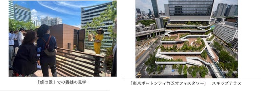 また、都心部でも希少な自然環境に囲まれた竹芝地区の立地特性を活かし、生物多様性保全への取り組みとして、東京ポートシティ竹芝オフィスタワーの2階から6階までのスキップテラスを中心に「空・蜂・水田・菜園・香・水・島・雨」の8つの環境テーマに対する取り組みから成る「竹芝新八景※」を展開し、「八景ツアー」の実施など、環境教育・地域交流・情報発信を行っています。もち米の田植え・稲刈りといった農体験や、養蜂や菜園での収穫物の実食や加工など、地域の方々との交流などを体験できる機会を提供しています。