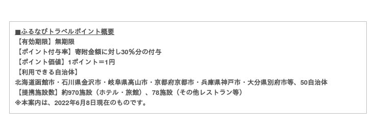 ふるさと納税先にある提携ホテル・旅館で利用可能な、無期限の電子ポイント(トラベルポイント)が返礼品として付与される、初めての方にも判りやすいふるさと納税サービスです。