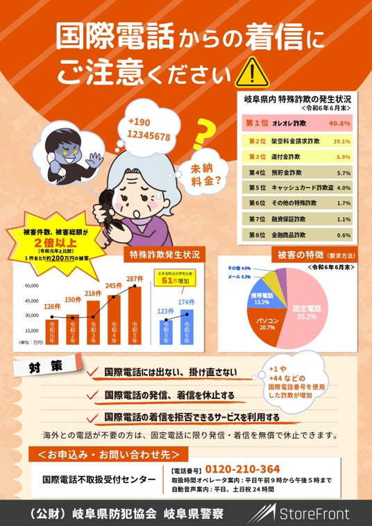 パフォーマンスマーケティング事業・メディア事業の株式会社インタースペース(所在地:東京都新宿区、代表取締役社長:河端伸一郎、証券コード:2122)のグループ会社である、迷惑電話対策サービス「ダレカナブロック」を提供する株式会社ストアフロント(本社:東京都新宿区代表取締役社長:岡田 英明)は、公益財団法人 岐⾩県防犯協会に対し、社会課題の解決に向けて特殊詐欺被害防止啓発チラシを合計2万4千枚寄贈し、2024年9月24日に岐阜県警察本部で寄贈式を行いました。この取り組みは、岐⾩県警察と岐⾩県防犯協会の協力のもとで実施し、増加傾向にある特殊詐欺の被害を1件でも減らすためのものになります。