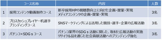 当企画は就職に意欲的な学生を支援することを目的に、2016年より継続開催しております。本年度は、会社の課題に対して若者視点で効果的な解決策を考え実行することをテーマに「採用動画制作」「スカッシュ机選手のブランディング」「パチンコ業界のSDGs」の3つのコースを設け、課題解決に取り組んでいただきました。