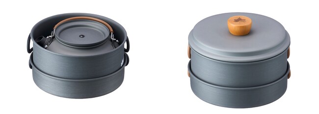 「LOGOS クッカー&ケトルセット」は、鍋とフライパンに加えケトルもセットになり、すべてを1つにまとめて収納できる便利なアイテムです。ケトルと鍋の蓋には、熱くならない木製のつまみが付いています。鍋とフライパンは持ち手を折り畳んでコンパクトに収納できるだけでなく、ケトルも鍋の中にぴったりと収まるので、場所を取らずに保管できます。