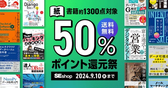 株式会社翔泳社(本社:東京都新宿区⾈町5、社長:佐々木幹夫)の運営する公式通販サイトSEshopは、 2024年9月3日(火)から9月10日(火) まで、紙書籍の新刊含む約1300タイトルが50%ポイント還元となる「SEshop紙書籍50%ポイント還元祭」を開催します。