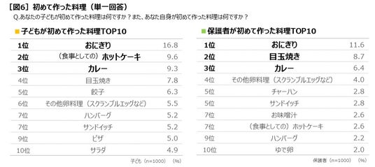 - 子ども世代が初めて作った料理は1位「おにぎり」、2位「ホットケーキ」、3位「カレー」。保護者世代が子どもの頃に初めて作った料理は1位「おにぎり」、2位「目玉焼き」、3位「カレー」。世代を通じて、おにぎりとカレーは初めての料理の定番メニュー。