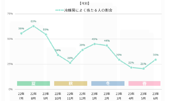 暑い時期と寒い時期は、エアコンの効いた環境にいることが多く、特に7~9月の夏の時期は、50%以上の人が「冷暖房によく当たる」と回答したことが分かりました。