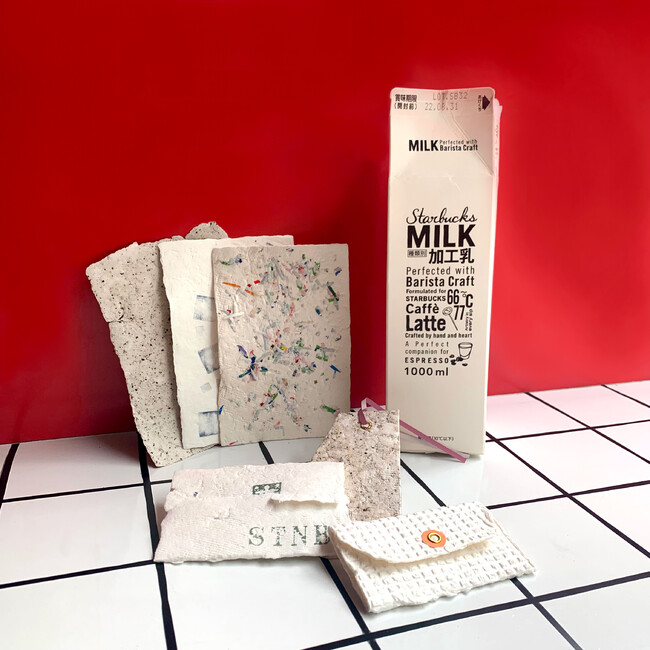 今回、コクヨの出展エリアでは、エコフレンドリー素材を採用したアイテムや生産終了品からの厳選アイテムが並びます。商品の共同開発を行っているスターバックス コーヒー ジャパン 株式会社(本社所在地:東京都品川区、代表取締役最高経営責任者(CEO):水口 貴文)のミルクパックを使ったワークショップも行います。