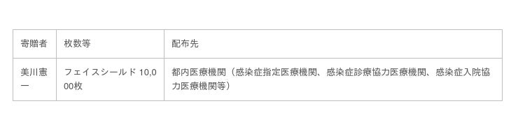 2020-06-13 東京都 フェイスシールドの寄贈及び配布について Tweet ~新型コロナウイルスに関する東京都からのお知らせ~ この度、東京都にフェイスシールドの寄贈が1件あり、下記のとおり配布しましたので、お知らせいたします。 [表: https://prtimes.jp/data/corp/52467/table/485_1.jpg ] 企業プレスリリース詳細へ PR TIMESトップへ 公式ツイッター Follow @Straightpress 最新情報をTwitterで受け取ろう! 公式フェイスブックページ 最新情報をFacebookで受け取ろう! 前の記事 一覧へ戻る 次の記事