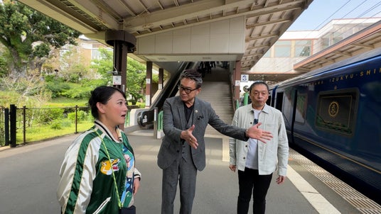 伊豆高原駅に着いた2人を待ち構えていたのは、何と俳優の船越英一郎。「張り込み中です」と、刑事ドラマさながらの緊張感?をぶち壊すように、友近は早々にいじりを加える。3人が乗り込むのは、人気観光列車「THE ROYAL EXPRESS」!さすがの礼二も「これ!近くで見るの初めて」と大興奮だ。