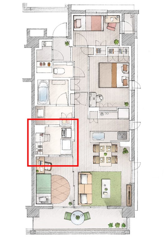 「家事クローク」には、マンション完成後の後付け設置は難しいとされる「ガス衣類乾燥機」を設置し、ガスだからこそできる高温乾燥により、洗濯家事の所要時間と手間を削減(※2)するとともに、インブルーム株式会社のお片付けコンシェルジュ監修のもと、家事動線をより効率化した新たな住空間を提案します。これにより、居室や室外で洗濯物を干す必要がなくなるため、天候や季節にかかわらず 24 時間 365 日、常にスッキリとした室内空間を維持することも可能となります。洗濯機と「ガス衣類乾燥機」の位置関係にも細かく配慮し、「ガス衣類乾燥機」を洗濯機の真上に設置する従来の縦置きではなく、今回は斜め置きにレイアウト(※3)。これにより、家族みんな手が届きやすく、洗濯機サイズの選択肢が増えるなど、従来の縦置きの課題を改善いたしました。