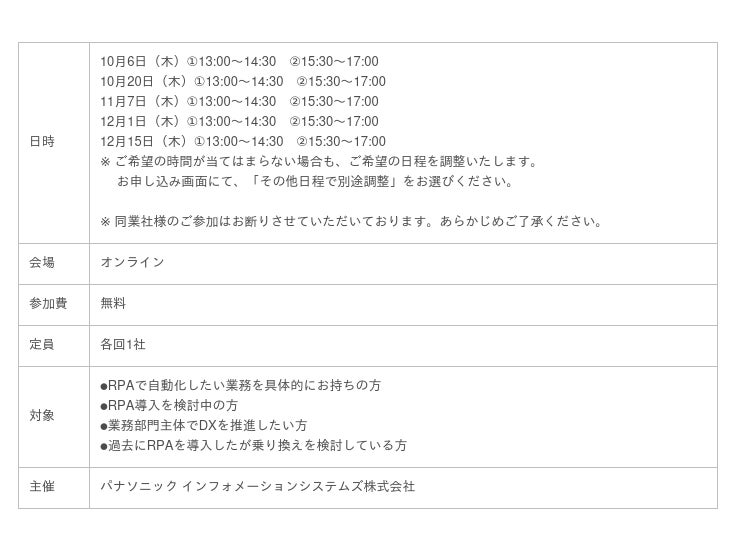 パナソニック インフォメーションシステムズ株式会社は、 2022年10月6日(木)から2022年12月15日(木)にかけて各回1社限定の、RPA「ロボオペレータ」個別相談会を実施します。