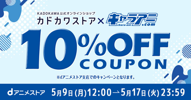 春アニメ 見放題最速配信数No.1(※)アニメ見放題サイト「dアニメストア」( https://animestore.docomo.ne.jp/ )では、2022年5月9日~5月17日まで「カドカワストア・キャラアニ限定 10%OFFクーポン」を配布いたします。