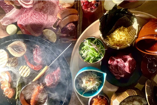 ■ 卓上でお肉を炙りお好きな具材を好きなだけ巻いて楽しむ今までにない新しいスタイルの手巻き牛寿司と、牛はらみ肉のワイルドステーキなど豪快に楽しむBBQパーティー