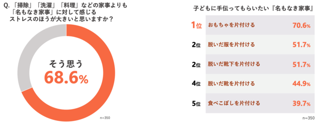 『名もなき家事』について尋ねたところ、68.6%が通常の家事よりも『名もなき家事』に対してストレスを感じていることが明らかになりました。さらに、子どもに手伝ってもらいたい『名もなき家事』を尋ねたところ、「おもちゃを片付ける」「脱いだ服を片付ける」「脱いだ靴下を片付ける」「脱いだ靴を片付ける」「食べこぼしを片付ける」といった、自分自身で使ったものや出したものの片付けがトップ5という結果に。