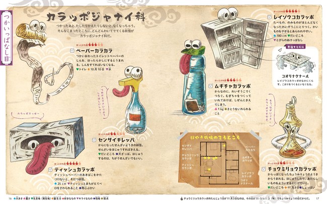 ぼやき妖怪が5つの「目」と10の「科」に分類されて紹介されます。<つかいっぱなし目 ソノママナノ科><ごちゃごちゃ目 アツメテルノ科>など、ユーモア溢れるネーミングはインパクト抜群です!