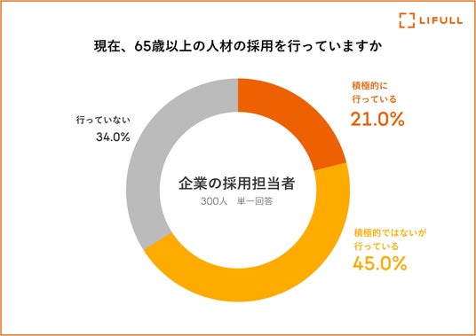 続いて、企業の採用担当者300名に65歳以上の人材の採用状況について聞いたところ、8割以上(83.0%)が人手不足であると回答していながら、現在65歳以上の人材の採用を積極的に行っているのはわずか2割(21.0%)ということが明らかになりました。