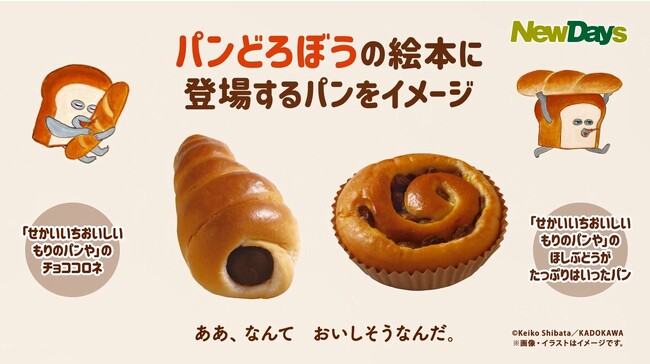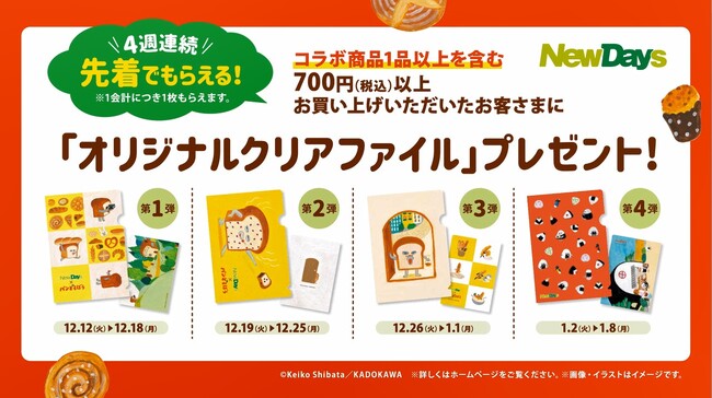 ●期間中は、パンどろぼうの絵本に登場するパンをイメージした商品など、NewDaysでしか買えないコラボ商品を全12商品発売します。また、コラボ商品1品以上を含む、700円(税込)以上ご購入のお客さまに、このキャンペーンでしか手に入らない、オリジナルクリアファイルを4週連続で先着でプレゼントいたします。