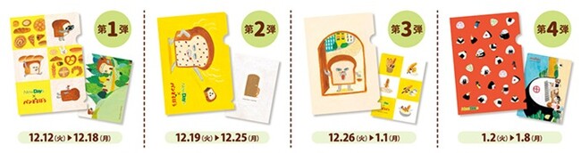 コラボ商品1品以上を含む700円(税込)以上ご購入のお客さまに、このキャンペーンでしか手に入らない「オリジナルクリアファイル」をレジにて先着でプレゼントいたします(数量限定・各店舗なくなり次第終了、1会計につき1枚のみ)。週替わりでクリアファイルのデザインが変わります。