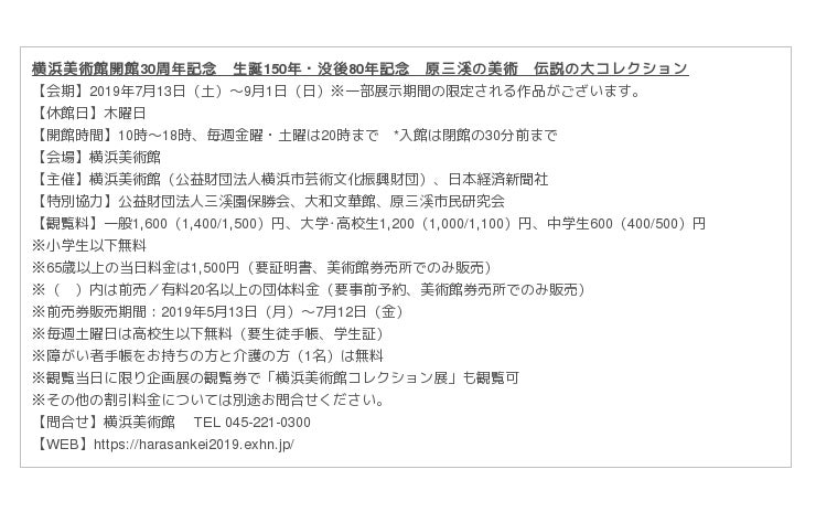 横浜美術館、日本経済新聞社は、2019年7月13日(土)~9月1日(日)まで、「横浜美術館開館30周年記念 生誕150年・没後80年記念 原三溪の美術 伝説の大コレクション」展を開催いたします。