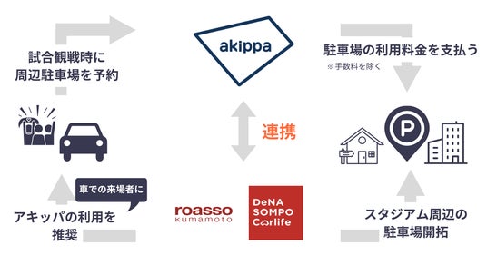 駐車場予約アプリ「アキッパ(akippa)」を運営するakippa株式会社(代表取締役社長 CEO:金谷元気)は、「ロアッソ熊本」を運営する株式会社アスリートクラブ熊本(代表取締役社長:藤本靖博)と連携し、ホームスタジアムである「えがお健康スタジアム」周辺にて予約制の駐車場を開拓することが決定しました。シーズン終了までに300台の駐車場確保を目指します。