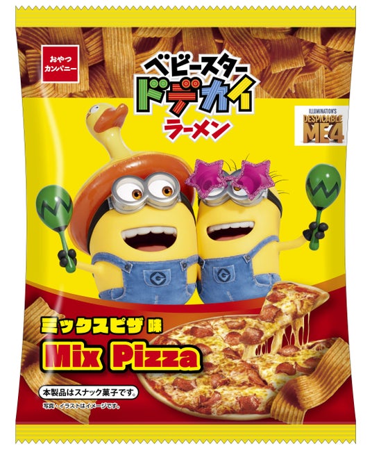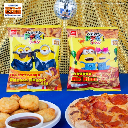 株式会社おやつカンパニー(本社所在地:三重県津市 代表取締役社長:横山正志)は、大ヒット公開中の映画『怪盗グルーのミニオン超変身』を記念し、「ミニオン」たちがデザインされたパッケージの「ベビースタードデカイラーメン(ミニオン ミックスピザ味/チキンナゲットBBQ味)」の2品を2024年7月22日(月)より、企画限定商品として全国にて発売します。