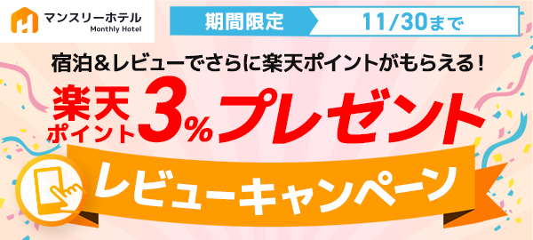2022年10月6日(木)~11月30日(水)中にレビューをご投稿いただいた方全員に、宿泊料金の3%を楽天ポイントで還元いたします。マンスリーホテルは通常時のご予約においてもご利用ホテルに応じて2%~4%の楽天ポイントを付与しており、キャンペーンと組み合わせることで最大7%のポイントが還元されます。