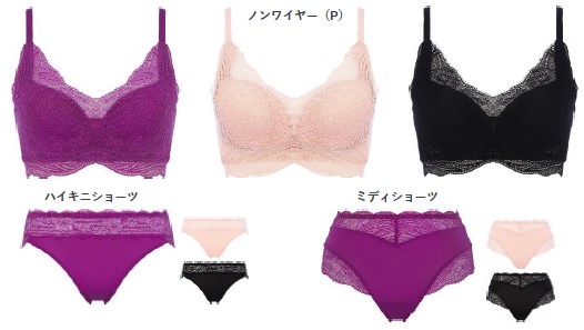 モダンなライン使いと優しげな花柄をミックスした一枚仕立てのレースが、シームレスに流れるようにボディを包み込みスタイリッシュ&フェミニンなカラーも魅力のシリーズです。