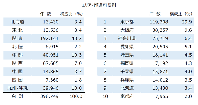 エリア別にみると、「関東」が19万2141社で最多。都道府県別では、「東京」が11万9308社で最も多く、「大阪」(3万8357社)、「神奈川」(2万5719社)が続く