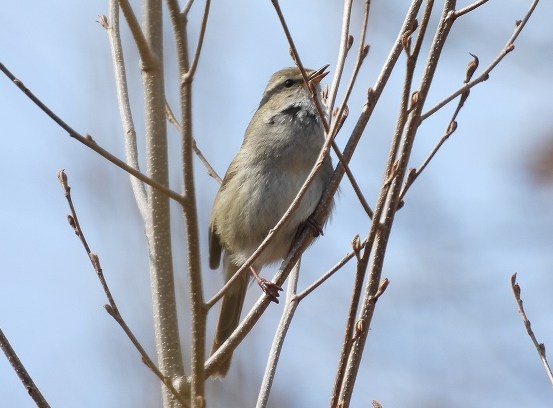 約20年前に、南大東島に進出したウグイスでは、さえずりの単純化は進んでいませんでしたが、本土では稀な、「ケ」の音が低くなる「ホーホ↓ケ↑キョ」という節回しでさえずる個体が多数でした。