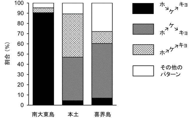 そこで、後半に「ホ」「ケ」「キョ」という3音を持つH型さえずりについて、それぞれの音の周波数の上下のパターン(節回し)を調べました。すると、南大東島では「ケ」の音が低い「ホーホ↓ケ↑キョ」という特異なパターンが大半を占めていました。本土でもこのパターンは4.5%見られることから、初めに本土から島に渡った少数の個体が偶然持っていたさえずりの特徴が今日の南大東島のさえずりを形作っていると考えられました。