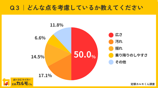 続いて、Q2で「考慮した」と回答した人に、どんな点を考慮しているか聞いたところ、最も多かったのが「広さ」で50.0%でした。具体的には、「車の中で移動できるスペースを考えた」「窮屈さを感じないようにした」など、犬が安心して過ごせるような広々とした空間があるかどうかが決め手となっています。次いで多かったのは17.1%が回答した「汚れ」で、「シートを革張りにしない」「汚れてもいい中古車を選ぶ」といった回答がみられました。「揺れ」と回答したのは14.5%で、「静音性や振動の少なさ」を重視することで、犬が酔わない工夫をしていることがわかりました。