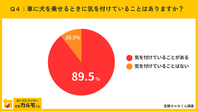 さらに、車に犬を乗せるときに気を付けていることがあるかどうか聞いたところ、「気を付けていることがある」が89.5%、「気を付けていることはない」が10.5%という回答になりました。