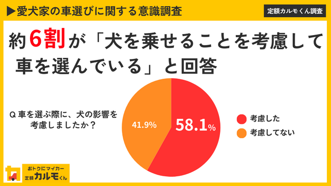 Q1で「乗せることがある」と回答した人に、車を選ぶ際に犬の影響を考慮したかどうか聞いたところ、「考慮した」が58.1%、「考慮していない」が41.9%となり、約6割が犬を乗せることを想定して車選びをしていることがわかりました。